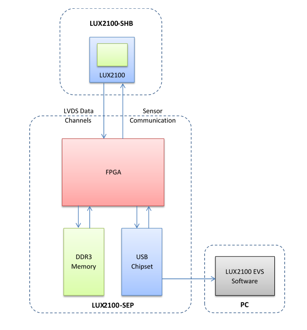 The LUXIMA™ LUX2100-EVS enables the user to evaluate the performance of the LUX2100 Sensor. The LUX2100 Sensor is a Global Shutter CMOS Digital Sensor with 2.1 Megapixel (1920 × 1080) @ 1,000 FPS. The LUX2100-EVS consists of the LUX2100-SEP, a Sensor Evaluation Platform, and the LUX2100-SHB, a Sensor Headboard.